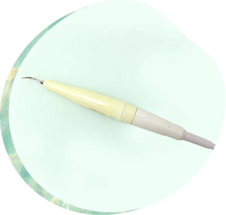 超音波による微細な振動と細い先端を使って、歯の表面や歯間にこびりついた、歯石などのしつこい汚れをしっかりと落とします。